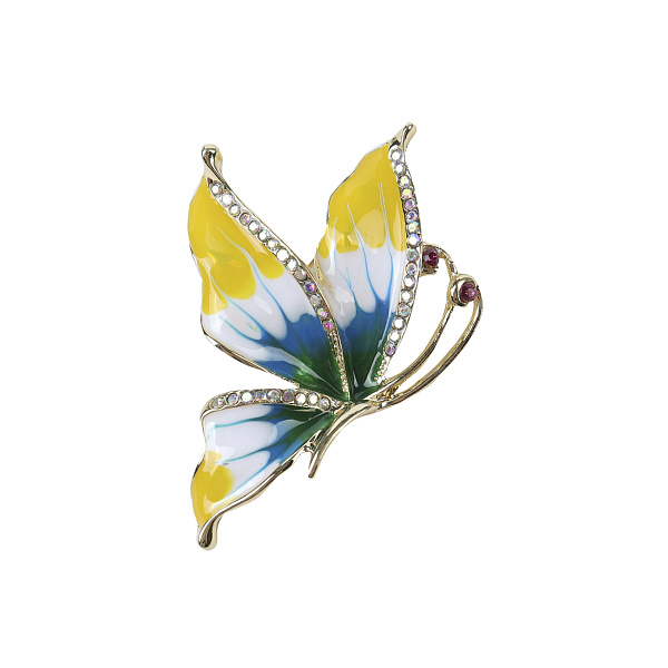 Яркая брошь «Бабочка» с желто-синими крыльями украсит повседневный или праздничный образ. Основа выполнена из металла золотистого цвета и окрашена эмалью белого, желтого, зеленого и синего оттенков. Края крыльев и концы усиков украшают стразы, которые красиво переливаются на солнце.