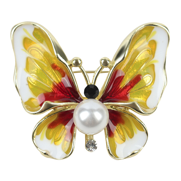 Очаровательная, по-летнему яркая брошь «Бабочка с жемчужиной» станет эффектным дополнением образа. Изготовлено украшение из золотистого металла в форме небольшой бабочки. Ее крылья окрашены в белый, желтый и красный оттенки. В центре приклеена перламутровая жемчужная бусина, а также две стразы: черная и прозрачная. Изделие красиво блестит и переливается на солнце. На одежду крепится с помощью булавки.
