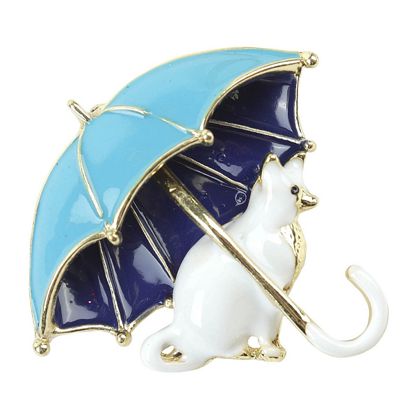 Милая брошь в форме кошки под зонтом подчеркнет индивидуальность ребенка и оживит его гардероб. Голубой зонт с золотистыми элементами контрастирует с белой изящной кошкой и добавляет повседневному образу шарма и изысканности.