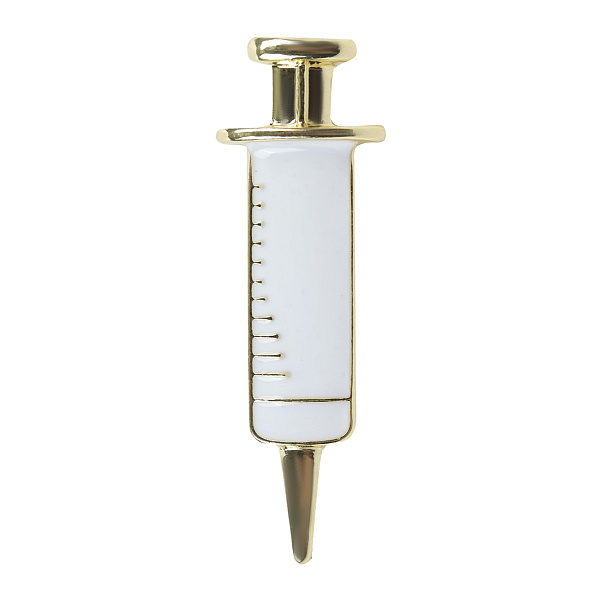 Миниатюрная брошь «Шприц» создана для тех, кто предпочитает оригинальные и нестандартные украшения. Изделие выполнено из металла золотистого оттенка. Лицевая часть покрыта белой эмалью. К ткани она крепится с помощью небольшой булавки. Брошку в виде шприца оценят медицинские работники, а также малыши, которые любят играть в доктора. Носить ее можно как на одежде, так и на сумочке или головном уборе.