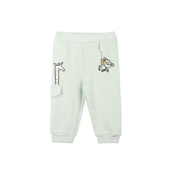 Удобные штанишки станут полезным дополнением гардероба малыша. Модель с высокой посадкой адаптирована для использования подгузников. Изделие имеет широкую трикотажную резинку, не оказывающую давления на внутренние органы ребенка, и манжеты в нижней части. Это гарантирует комфортную посадку, исключает нежелательное смещение. Украшением служат изображения забавных животных и имитация клапана кармана на боку.