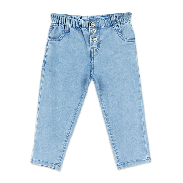 Брюки имеют классической крой, характерный для джинсов. Пояс на облегченной резинке дополнен шлевками для ремня, которые застегиваются тремя вертикально расположенными пуговицами. По бокам имеются полукруглые карманы.