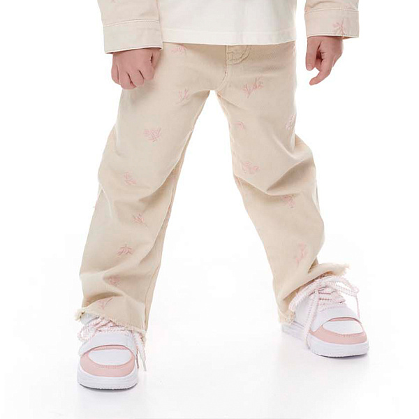 Джинсы выполнены из хлопка, что делает их мягкими и приятными на ощупь. Они представлены в стильном бежевом цвете, который станет универсальной основой для различных детских нарядов. Приятная на вид и на ощупь нежная вышивка в виде небольших цветочных узоров добавляет изделию изысканности и оригинальности.