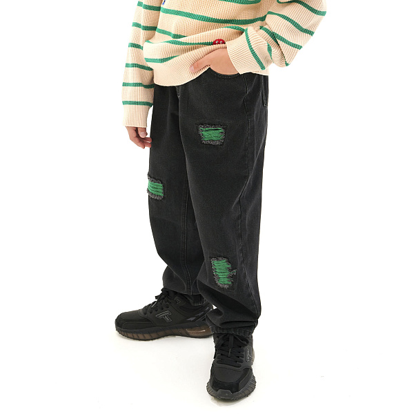 Утепленные джинсы для мальчика — настоящая находка для холодного времени. Они выделяются эффектными рваными вставками с зелеными нитками, которые придают дерзкий и энергичный вид. Черный цвет смотрится глубоко и современно, отлично подходит для активных игр и прогулок.
