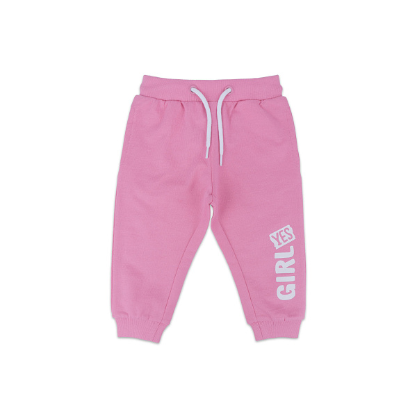 Детские спортивные брюки нежного розового цвета понравятся каждой девочке, даже если она слишком мала. В составе ткани использован хлопок, который хорошо пропускает воздух и защищает тело отперегрева. Верхняя часть брюк и штанины дополнены эластичными резинками, которые плотно фиксируют одежду на теле. Дополнительно отрегулировать штаны по объема талии помогут белые шнурки. Завершает образ белая надпись в нижней части штанин. Такие штаны не только добавят нежности в образ, но и обеспечат комфорт в течение дня.