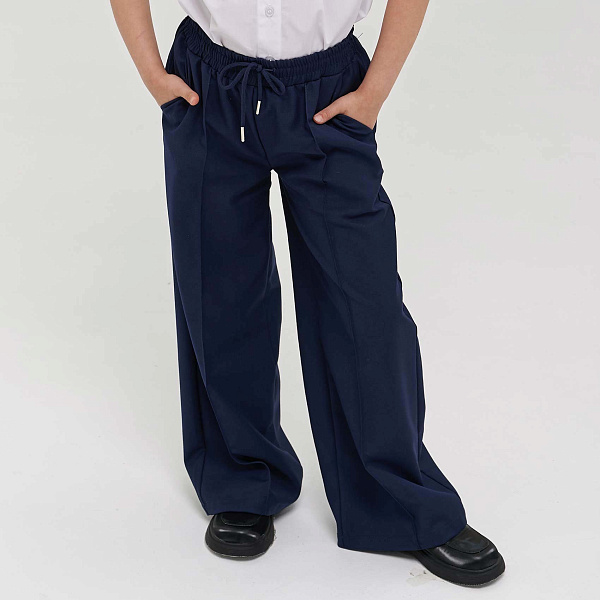 Синие школьные брюки-палаццо для девочки отлично подходят для учебы. Пояс на резинке со шнурком позволяет легко подогнать размер. Это удобно для активного дня.