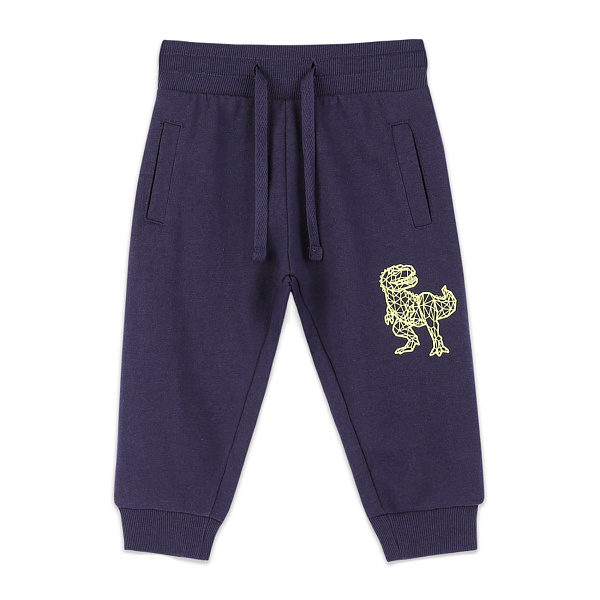 Удобные повседневные брюки для мальчиков в спортивном стиле. У модели свободный и комфортный крой с мягкими резинками на щиколотках и поясе. Ремень в виде шнурка позволяет дополнительно регулировать посадку. Брюки немаркого темно-синего цвета с небольшим желтым рисунком динозавра на штанине. По бокам два кармана, куда малыш сможет положить мелкие вещи.