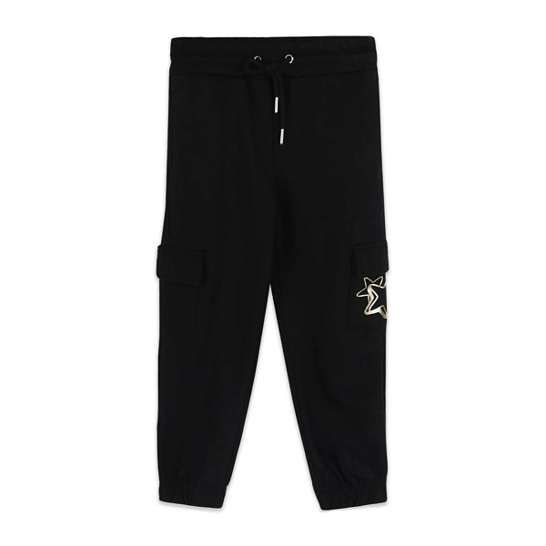 Удобные и легкие брюки одобрит любая юная модница. Модель оформлена в спортивном стиле, дополнена накладными карманами по бокам. Золотистые звездочки на одном из них смягчают лаконичный дизайн, подчеркивают нежный образ маленькой девочки. Изделие не сковывает движения, фиксируется на талии широким поясом с резинкой. При необходимости посадку можно скорректировать с помощью шнурка.
