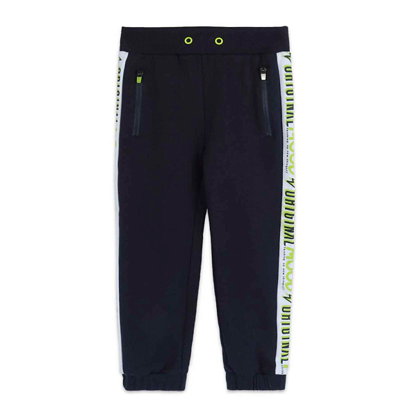 Легкие брюки спортивного кроя являются незаменимым элементом гардероба любого мальчика. В них удобно бегать, гулять, играть с друзьями. Модель имеет широкий пояс с резинкой и высокую посадку. Это исключает нежелательное смещение, не отвлекает ребенка от важных дел. Для оформления использована практичная цветовая гамма. Украшением служит боковая вставка контрастного цвета с графической надписью.