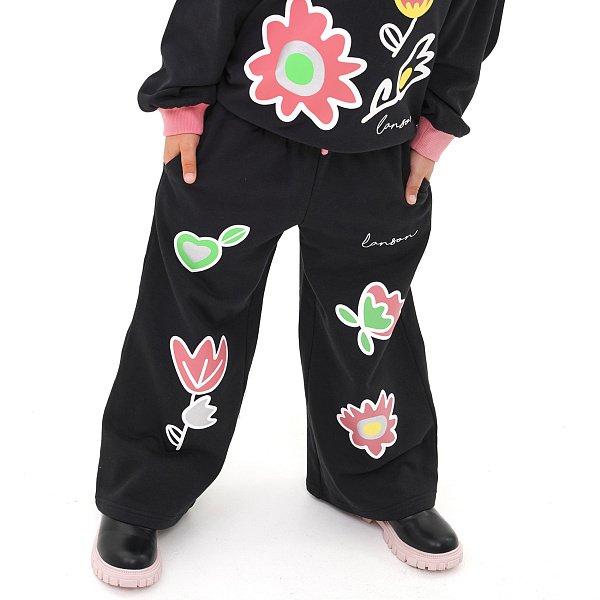 Широкие брюки для девочки станут основой для повседневного гардероба. Черный цвет с крупными, яркими цветами на передней части придают им выразительность. Пояс на резинке дополнен розовым шнурком.