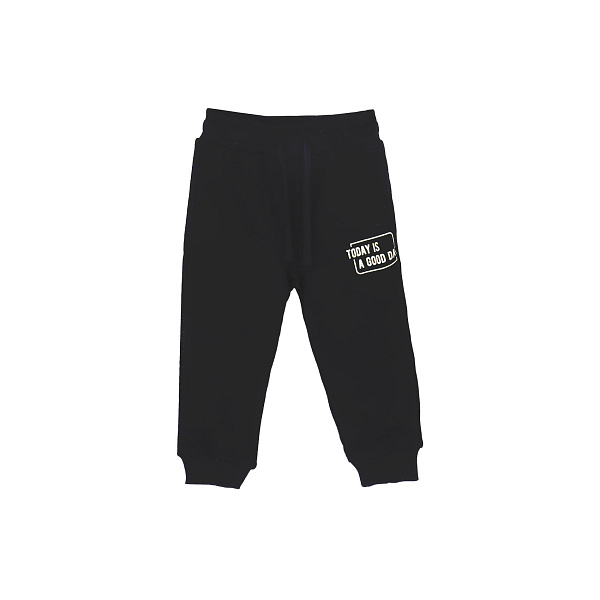 Незаменимым элементом гардероба мальчика являются свободные брюки. Их удобно носить дома и на улице, можно задействовать в качестве нижнего слоя в холодную погоду. Штаны гармонично сочетаются с любыми футболками, толстовками и худи. В качестве украшения применяется контрастная графическая надпись.