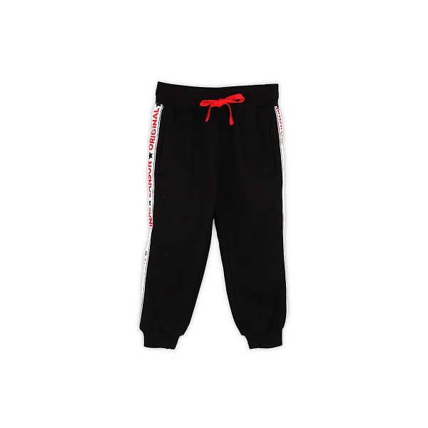 Утепленные брюки изготовлены из хлопка с добавлением полиэстера, благодаря чему они не усаживаются, плотно облегают ноги и хранят тепло. Штанины прямого свободного кроя, широкий пояс на резинке, дополнительно пояс можно утянуть мягким текстильным шнуром. Штанины завершаются эластичными трикотажными манжетами, которые плотно охватывают щиколотку. Цвет брюк темно-синий, утягивающий шнур красный. По бокам штанин проложены широкие белые лампасы, украшенные названием бренда Lanson. Рекомендовано для детей ясельного возраста.