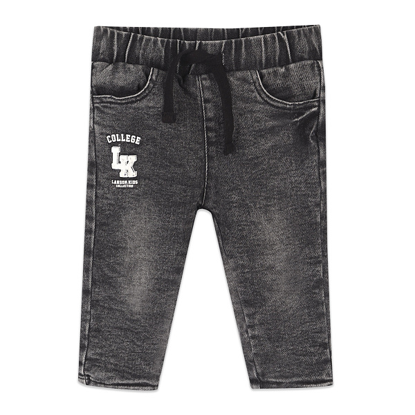 Утепленные джинсовые брюки для мальчиков выполнены в универсальном темно-сером цвете с легким эффектом потертостей. Модель оснащена двумя передними карманами и стильной вышивкой с надписью на правой стороне. По верхнему краю брюк проходит эластичный пояс с завязками, что обеспечивает удобную и надежную посадку на талии ребенка.