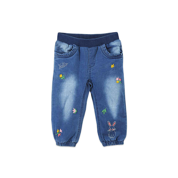 Утепленные джинсы органично впишутся в повседневный гардероб маленькой модницы. Брюки пошиты из натурального хлопка, полиэстера и эластана. Сочетание материалов обеспечивает упругость, мягкое прилегание к телу, естественный обмен воздуха и комфорт в процессе носки. Утепленная подкладка из полиэстера препятствует проникновению холодного воздуха. Низ штанин дополнен резинками, они плотно прилегают к телу и дополнительно утепляют ноги. Пояс на резинке плотно зафиксирует джинсы на теле и не позволит спадать им. Завершают дизайн боковые карманы и декор в виде вышитых цветов и кроликов. Рекомендовано для детей ясельного возраста.