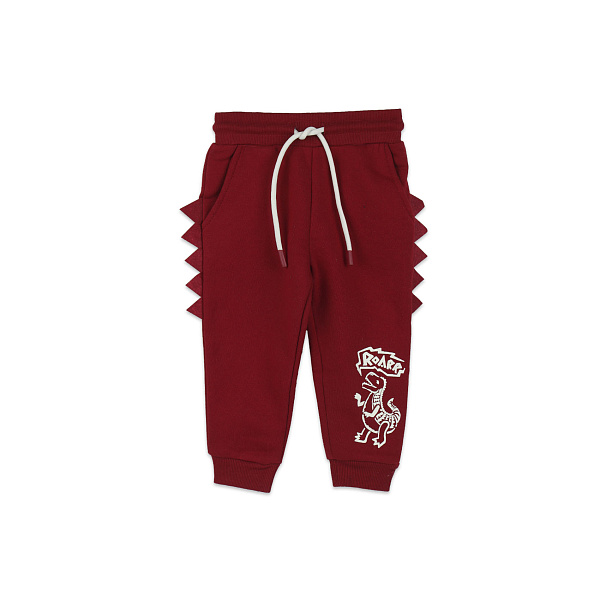 Утепленные брюки согреют ребенка в холода и осеннюю прохладу. Штаны выполнены в спортивном стиле, крой свободный и не сковывающий движения. Внешняя сторона пошита из хлопка и полиэстера, изнутри имеется флисовая подкладка. Верх брюк дополнен широкой эластичной резинкой с шнурками. Резинка плотно удерживает штаны на поясе, но не сдавливает живот. Низ штанин также дополнен эластичными манжетами, которые не пропускают воздух. Завершает дизайн принт динозавра внизу штанин, а также шипы динозавра на боках. Рекомендовано для детей ясельного возраста.