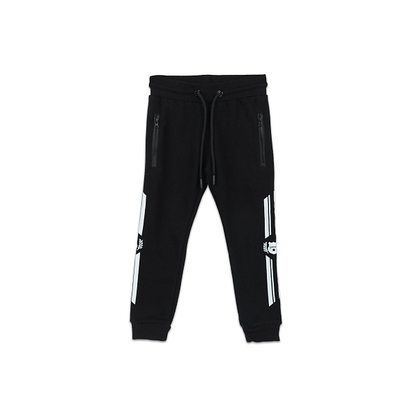 Утепленные трикотажные брюки из хлопка с добавлением полиэстера подойдут активным малышам. В межсезонный период это практичная и комфортная одежда, не стесняющая движений и достаточно теплая. Изделие прямого свободного кроя, пояс на резинке дополнен прочными трикотажными шнурами. Штанины на манжетах, они плотно прилегают к телу и не пропускают холодный воздух. В брюках два боковых кармана, которые застегиваются застежкой-молнией. Цвет брюк черный, бока дополнены белым принтом с полицейскими жетонами. Рекомендовано для детей ясельного возраста.