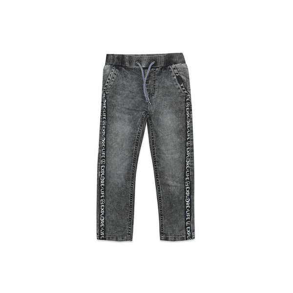 По бокам штанин эффектный декор - стильная черная лента с белыми надписями, которая делает брюки модными и современными.