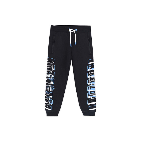 Основной цвет — черный. Сбоку присутствует яркий графический рисунок из надписей белого и голубого цветов. Пояс — кулиска с белым шнурком. Брюки снизу дополнены черными резинками, фиксирующими штанины на лодыжках. Два кармана закрываются на молнии.
