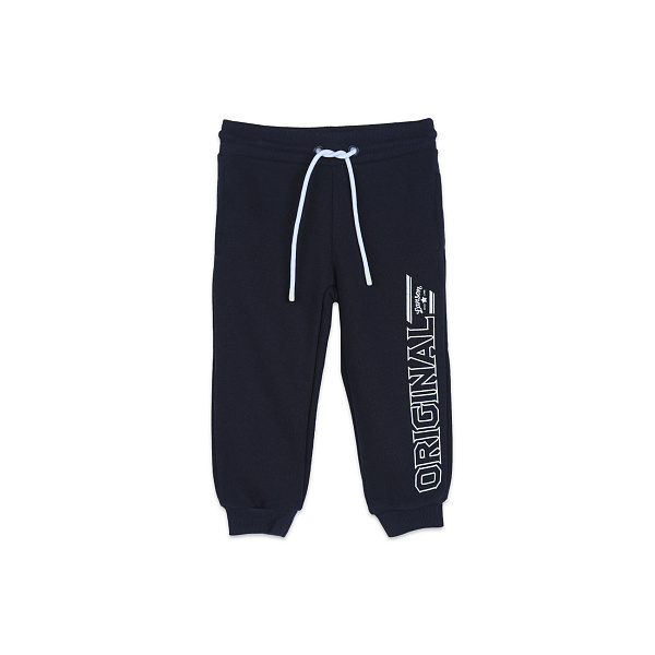 Утепленные брюки из трикотажа с подкладкой предназначены для дома, игр на улице, поездок на дачу, активных игр на воздухе в межсезонный период. Зимой их можно надевать под зимние штаны для дополнительного утепления ног. Брюки прямого покроя, эластичный мягкий пояс регулируется белым шнуром. По бокам вшиты вместительные карманы. По низу штанин располагаются эластичные трикотажные манжеты, плотно охватывающие ногу. На левой штанине крупный принт – надпись белыми буквами «original». Цвет изделия темно-синий. Такие штаны удобны в ношении, не ограничивают свободу движений, ткань на основе хлопка и полиэстера приятно прилегают к телу и хорошо пропускают воздух. Рекомендовано для детей ясельного возраста.