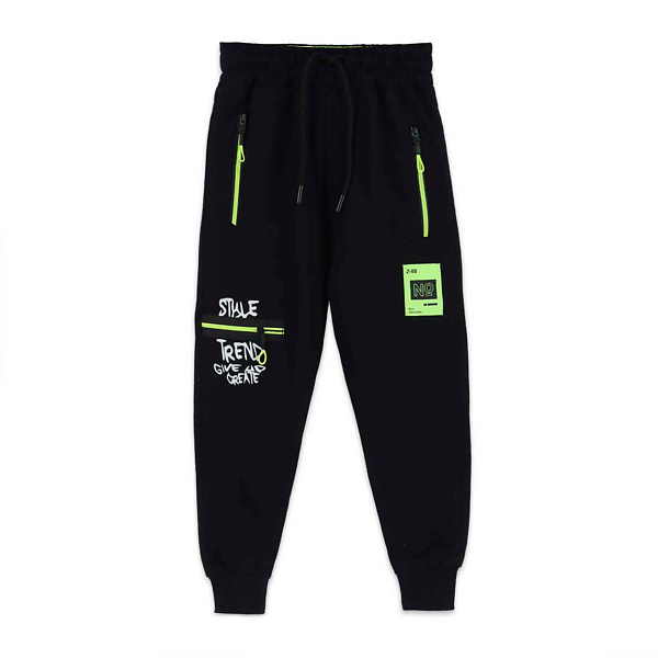Удобные брюки спортивного кроя станут базовым элементом гардероба любого мальчика. Они имеют высокую посадку и широкий пояс с резинкой и фиксирующим шнурком. Манжеты в нижней части позволяют легко скорректировать длину изделия. Свободный крой не отвлекает ребенка от активных игр, обеспечивает комфорт в течение дня. Для оформления выбрана практичная цветовая гамма, которую оживляют яркие молнии на карманах и графические изображения.