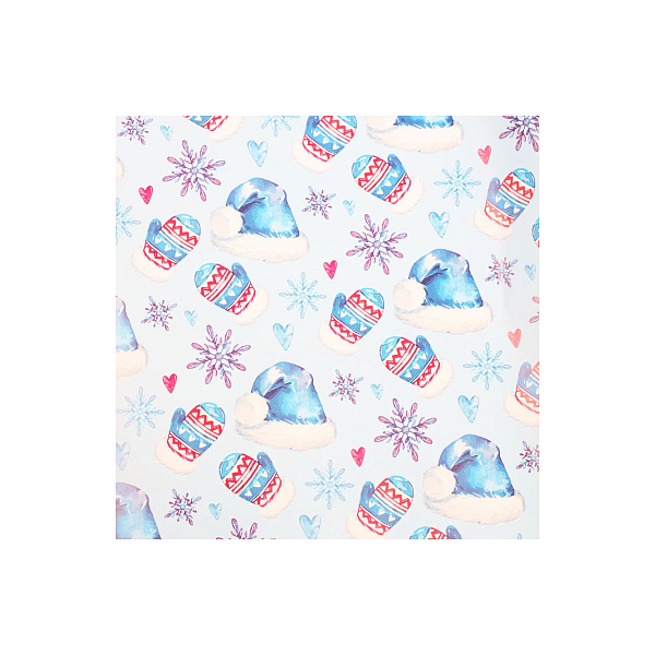 Упаковочная бумага «Зимняя сказка» предназначена для декорирования подарков, букетов цветов и новогодних композиций. Упаковочная бумага представлена в виде рулона размером 100х70см. Нежный голубой фон усеян разноцветными снежинками, сердечками, полосатыми рукавицами (синий, белый красный цвета) и шапками с белыми помпонами. Сочетание голубого, фиолетового, синего и красного цветов создает особую атмосферу уюта и зимней сказки. Подарки с такой упаковке приобретут новогодний вид и настроят на празднование главного праздника года.