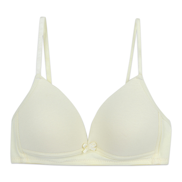 Бюстгальтер выполнен в пастельно-желтом цвете. Модель имеет простой дизайн с гладкой тканью и без подкладки. На центре лифа расположен маленький бантик из ткани. Бретели тонкие, не снимаются, но их длина регулируется. Застежка на спинке в виде двух крючков в три ряда.