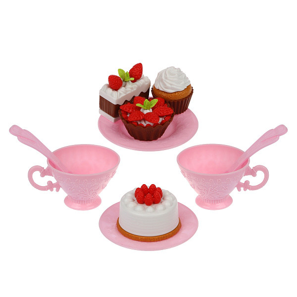 В комплект входят: 2 чашки (8,5х5х5 см); 2 блюдца (8,5х8,5 см); 2 ложки длиной 10 см; 4 пирожных (4х2х4 см, 5,5х5,5х3,5 см, 4,5х4,5х3 см и 3,5х3,5х4 см).