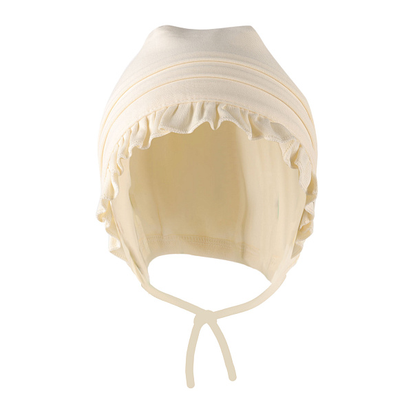 Трикотажный чепчик для девочки выполнен из мягкого хлопка. Материал позволяет коже дышать и не вызывает раздражения, что важно для чувствительной детской кожи. Модель выполнена в нежном кремовом цвете, подходит для ежедневного использования.