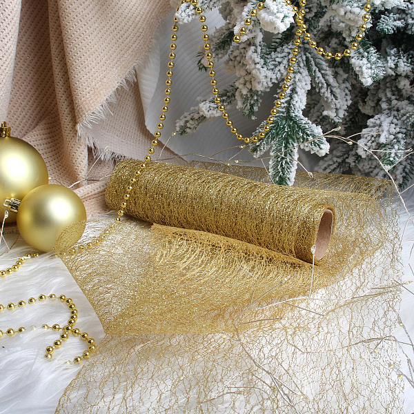 Золотая, едва поблескивающая золотая паутинка может использоваться для украшения подарков, новогодней елки, витрин и даже интерьера и праздничного стола. Она придаст торжественности и праздничности благодаря золотому цвету и переплетению тонких нитей. Ширина ленты 20см, она достаточно широкая, чтобы украсить подарки, стол или обернуть букет. Нити паутинки очень тонкие и покрыты мелкими блестками, которые игриво сверкают и переливаются в свете ламп. В сочетании с лентами, бантами и елочными украшениями она подарит праздник, чудо и ожидание Нового года.