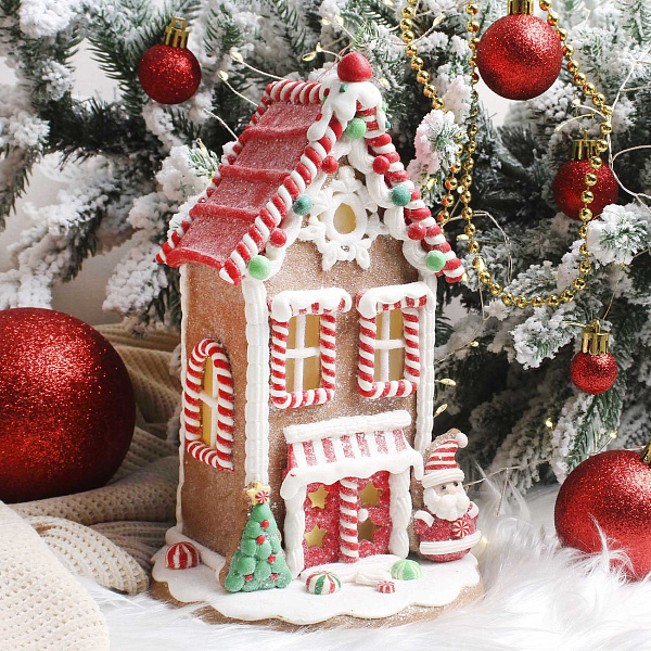 Новогодний декоративный пряничный домик высотой 22 см, выполненный из полирезины с детальной покраской и имитацией сладких элементов. Крыша украшена яркими красно-белыми полосатыми леденцами, и зелеными декоративными шариками, создавая атмосферу праздничного уюта. Стены дома оформлены под текстуру настоящего пряника и декоративными элементами, имитирующими глазурь. Вокруг основания расположены миниатюрная елочка и фигурка Санты в красном наряде, которые дополняют сказочный образ домика. Прозрачные окна пропускают свет, создавая теплое мягкое свечение, которое наполняет пространство волшебством и радостью.