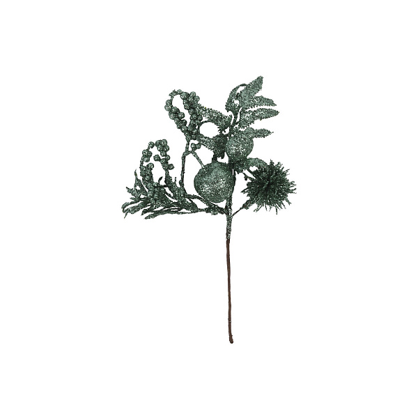 Создать дома праздничную атмосферу можно с помощью новогодних украшений, например, небольшой ветки с разнообразным декором на ней. Изделие окрашено краской с зелеными блестками. Выглядит празднично и нарядно. Веточка выполнена из пластика. Состоит из нескольких видов листьев, небольших ягод и других растительных элементов. Ее можно добавить в новогоднюю композицию, украсить рождественский венок, вплести в елку или еловую гирлянду. Сочетая ее с другими праздничными элементами, создайте собственный уникальный новогодний дизайн своего дома. Он поможет всей семье почувствовать приближение праздника.