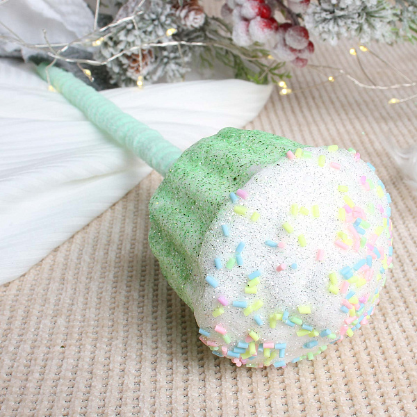 Новогодний декор «Кекс» зеленый станет ярким украшением праздничного интерьера. Изделие выполнено в виде большого кекса с зеленой основой и белой «глазурью», украшенной разноцветными элементами, имитирующими посыпку. В декоре использован пластик с блестящим эффектом, который придает поверхности легкое мерцание. Длина ветки — 50 см.