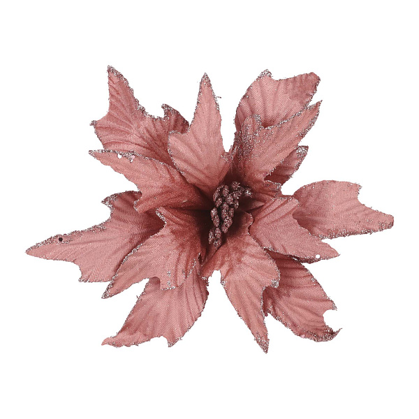 Декоративный цветок пуансеттии станет изысканным акцентом в новогодней композиции. Лепестки выполнены из прочного текстиля, который не только долговечен, но и устойчив к внешним воздействиям. Каждая деталь покрыта серебристыми блестками, придающими изделию особое сияние и праздничность. Цветок выполнен в нежном розовом оттенке. Универсальный дизайн позволяет использовать украшение для декорирования елок, венков и праздничного стола.