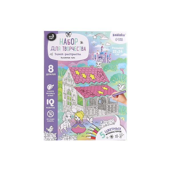 Отличным подарком для ребенка дошкольного возраста станет раскраска в виде домика. В комплект входят 8 частей конструкции с нанесенными на них шаблонами и 5 фломастеров разного цвета.