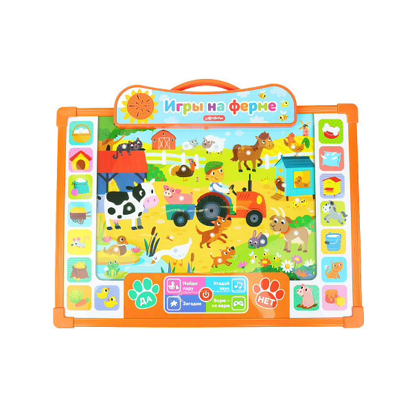 Развивающая говорящая доска 2в1 «Игры на ферме» — это интерактивная игрушка, которая не только развлекает, но и учит малышей. У доски две стороны: на первой расположена яркая картинка с животными на ферме и кнопками. Нажимая на них, ребенок сможет играть в интересные игры, учить голоса животных и петь песни – всего в программе записано 200 вопросов. Вторая сторона — для рисования. К ней в комплекте идет фломастер со специальным ластиком, стирающим любые рисунки и написанные слова. Благодаря удобной ручке доску можно брать с собой на прогулки и в путешествия. Длина доски 35см.