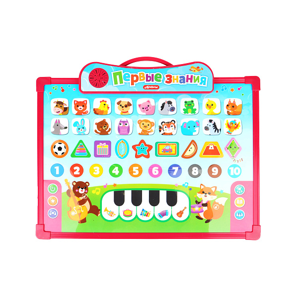 Легко и весело учиться вместе с говорящей доской «Первые знания». Это яркая двухсторонняя обучающая игрушка для детей старше 3 лет. Первая сторона состоит из говорящих картинок, нажимая которые, ребенок быстро выучит названия цифр, цветов, форм, голоса животных и звуки музыкальных инструментов. Он также сможет прослушать обучающие песенки и сказки, а для проверки полученных знаний предусмотрены четыре умных обучающих игры. Вторая сторона – доска для рисования и записи. Использовать можно любые цветные фломастеры. В комплекте маркер со специальным ластиком в колпачке, который позволяет быстро очистить поле и начать заново.