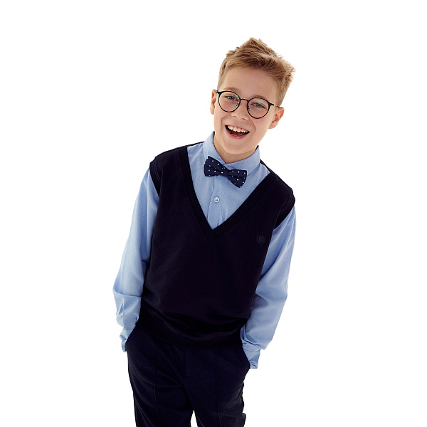 Джемпер для школьного гардероба мальчика представлен в оригинальном исполнении. Он пошит в виде голубой рубашки с воротником стойкой и черной жилеткой, сшитыми между собой. Изделие выполнено из натурального хлопка 100%, поэтому дарит комфорт коже ребенка в течение дня. Изделие имеет свободный крой, эластичные манжеты и пояс, поэтому пиджак не ограничивает движения ребенка. Благодаря вшитым пуговицам оно застегивается под горло и не пропускает холодный воздух в прохладные дни, защищая юного школьника от переохлаждения.