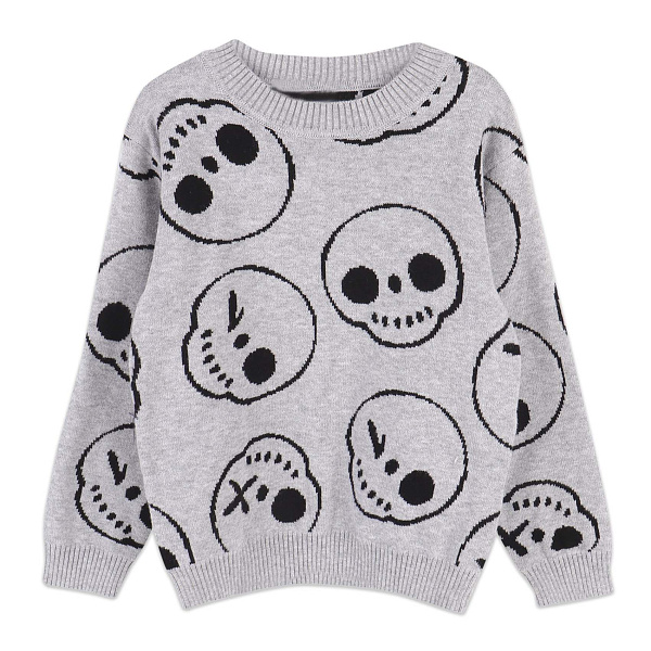 Серый джемпер для мальчика выполнен из качественной ткани, состоящей на 90% из хлопка и на 10% из нейлона. На передней и задней части изделия размещен оригинальный принт с черепами черного цвета, добавляющий джемперу стильный и модный вид.