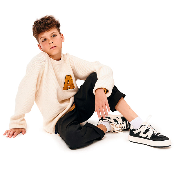 Вязаный джемпер для мальчика выполнен в стильном дизайне с яркой нашивкой в виде буквы на груди. Состав: вискоза 51%, полиэстер 27%, нейлон 22%. Джемпер приятно касается кожи, не колется, пропускает воздух и не вызывает раздражения. Кремово-белый цвет подходит для любого случая, а контрастные полоски на рукавах и понизу добавляют оригинальности.