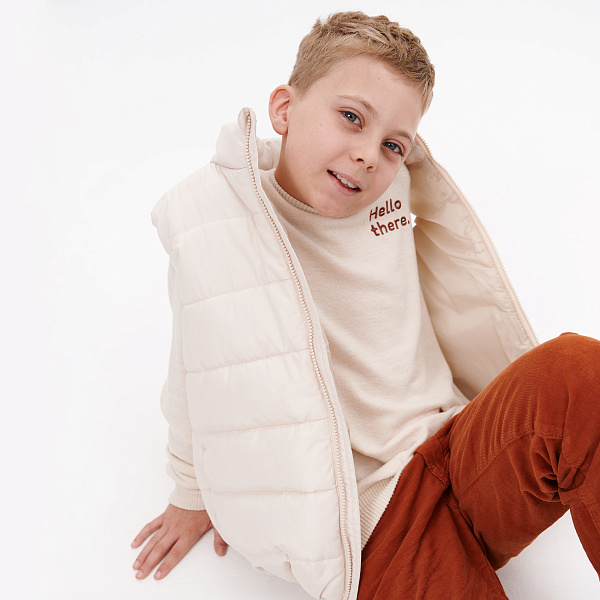 Бежевый джемпер для мальчика сочетает в себе стильный дизайн и практичность. Изготовлен из смесового материала: полиэстер (55%), вискоза (40%) и эластан (5%), что обеспечивает мягкость, эластичность и долговечность изделия. Джемпер комфортно сидит на теле, не сковывает движений, что особенно важно для активных детей.