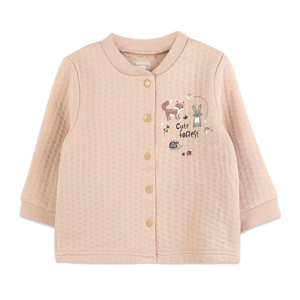 Прямая кофта предназначена для маленького мальчика, подарит ему комфорт и уют. Модель с манжетами на рукавах не сковывает движения, полностью расстегивается. Аккуратный воротничок не натирает шею, бережно прилегает к ней. Изделие привлекает внимание фактурным узором полотна. Украшением служит забавная вышивка на полочке с изображением милых лесных животных.