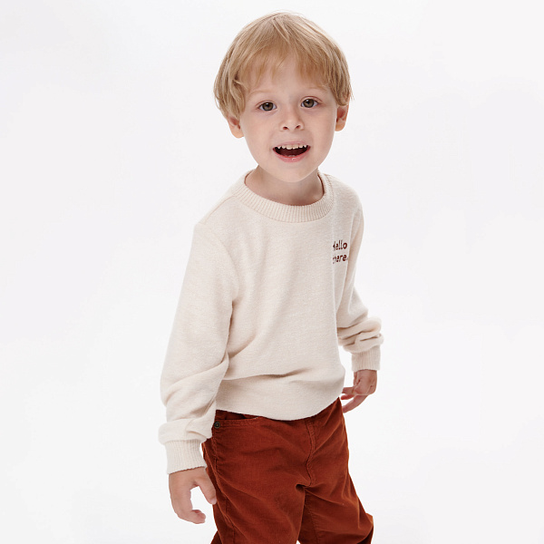 На передней части джемпера размещена надпись «Hello there», добавляющая изделию оригинальности. Круглый воротник, не натирает и не раздражает кожу. Рукава и низ джемпера имеют эластичные манжеты, которые сохраняют тепло и не пропускают холодный воздух.