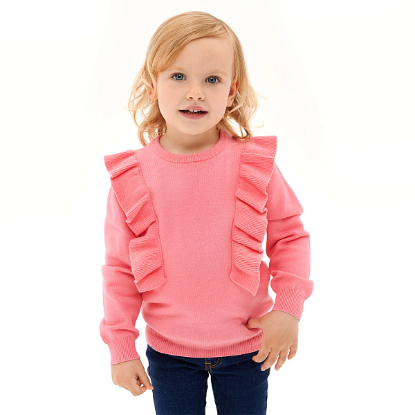 Нежный джемпер с рюшами для девочки в ярком розовом цвете — это сочетание уюта и комфорта. Особое очарование изделию придают аккуратные рюши по линии плеч, которые придают образу легкость.