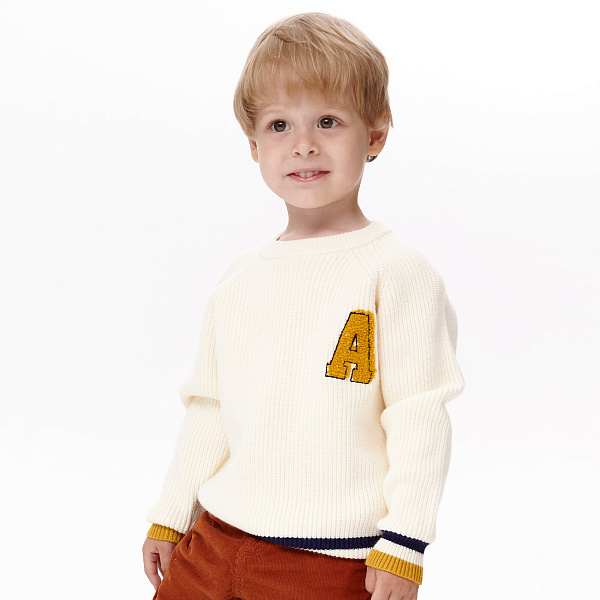 Джемпер для мальчиков, представленный в нежном кремовом цвете, украшен стильной аппликацией с буквой «А» на груди. Лаконичный дизайн дополнен контрастными полосками внизу и на манжетах в приятных оттенках, что придает изделию современный вид. Джемпер выполнен из мягкой и уютной пряжи, в состав которой входят вискоза (51%), полиэстер (27%) и нейлон (22%), обеспечивая комфорт и тепло.