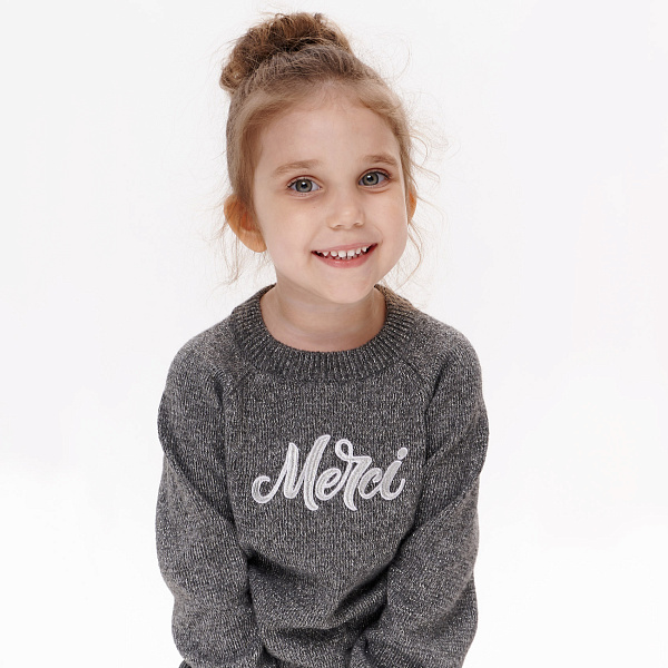 Джемпер для девочки – идеальный выбор для прохладной погоды. Он выполнен в темно-сером цвете с блестящей люрексовой нитью, что придает ему нарядный вид. На груди расположена аккуратная белая надпись.