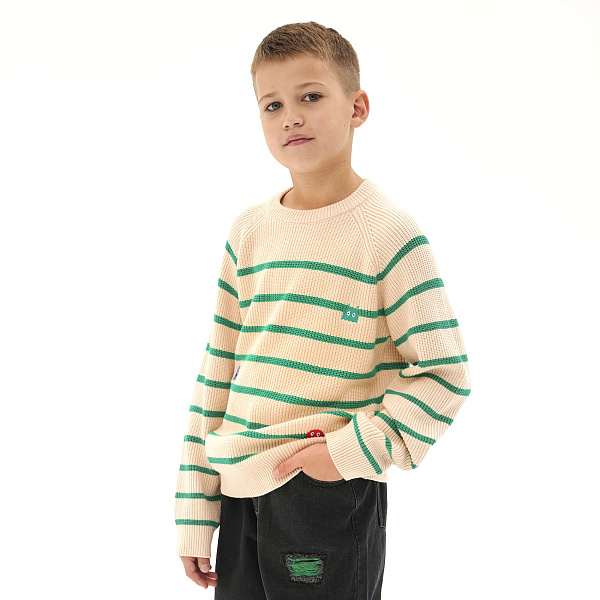 Джемпер для мальчика выполнен в нежном бежевом цвете с зелеными полосками. Ткань украшена милыми разноцветными монстриками — маленькими вышивками на лицевой стороне, которые придают веселый и необычный вид. Приятный на ощупь вязаный материал с плотными манжетами и классическим воротом создает комфортный и стильный образ.