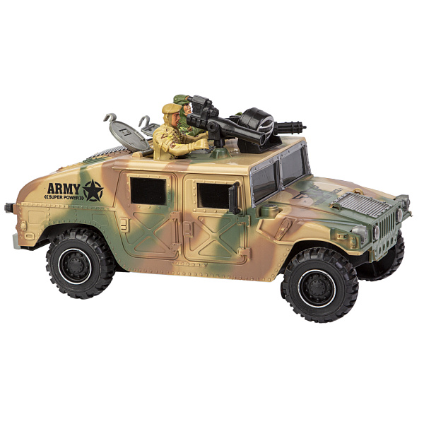 Брутальный армейский внедорожник имеет реалистичное исполнение и дополнен парой вооруженных солдат. Такая машина обрадует каждого мальчика и послужит поводом для увлекательных игровых сюжетов военной тематики. Автомобиль имеет прочный кузов из экологичного пластика, широкие рельефные колеса. Материал не впитывает влагу, легко отмывается от грязи. Использовать технику можно дома и на улице. Взаимодействие с изделием развивает воображение, логическое мышление, моторику рук.