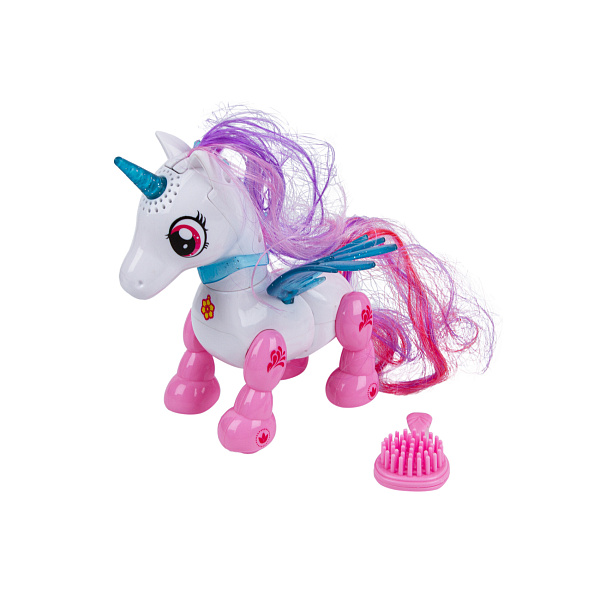 Интерактивный общительный единорог для малышей поможет малышу стать более общительным и разнообразит досуг ребенка. Игрушка работает от встроенной батареи, поет веселые песни, разговаривает, при проигрывании детских песенок включаются расположенные на корпусе и голове цветные огоньки, что придает игрушке волшебный вид. Использование интерактивных игрушек способствует развитию речи у детей, вырабатывает способность логически мыслить и сопоставлять события при управлении игрушкой, развивает моторику рук. Игрушка не только поднимет ребенку настроение, но и поможет ему разучить детские песни и сказки, вызывая сначала активное повторение, а после и самостоятельные пение и пересказ. В комплект входит расческа для гривы единорога. Игрушка изготовлена из пластика, рекомендуется для малышей старше 3 лет.