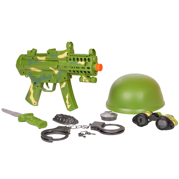 Это набор профессионального военного, потому что в нем представлена вся необходимая экипировка: военный автомат, каска защитного зеленого цвета, рация, наручники, чтобы задерживать опасных преступников. Также в набор водят компас и бинокль, чтобы ориентироваться на местности.