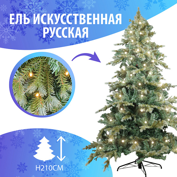 Ель искусственная русская зеленая с электрическими гирляндами 210см